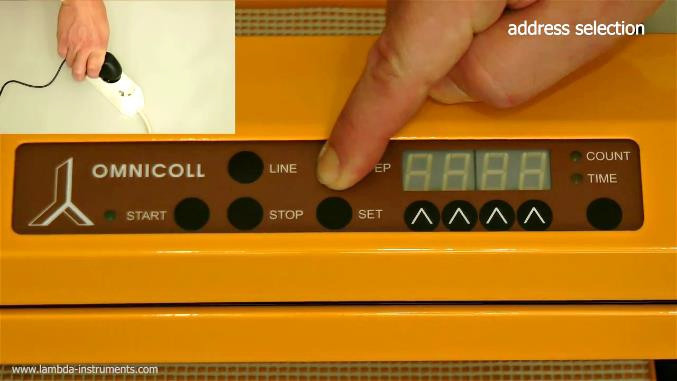 While keeping the direction button STEP pressed connect the fraction collector to the mains.